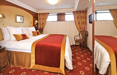 Elegantly designed 183 sq. ft. cabin Bed size: 62 inches X 77 inches (with optional twin-bed configuration) 400 thread count cotton linens\duvets filled with 90% hypoallergenic down\pillows filled with 100% Hungarian goose down, memory foam pillow also available Marble bath with shower Molton Brown toiletries – a Tauck Exclusive Terry-cloth bathrobe plus slippers Refrigerator stocked with complimentary water and soft drinks replenished daily 32” LED TV 220v and 110v outlets in cabin and bathroom Two chairs plus a desk Built-in closet with drawers Easy under-bed luggage  storage Telephone, safe and individual climate control Onboard wi-fi available