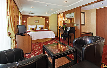 Elegantly designed 300 sq. ft. suites Bed size: 62 inches X 77 inches (with optional twin-bed configuration) 400 thread count cotton linens\duvets filled with 90% hypoallergenic down\pillows filled with 100% Hungarian goose down, memory foam pillow also available Two floor-to-ceiling French Balconies, each 98 inches wide x 75 inches high each with one sliding door that opens Quad cabin made possible by pullout couch (only for children) Large bathroom with marble bath and separate shower and bathtub Molton Brown toiletries – a Tauck Exclusive Terry-cloth bathrobe plus slippers Coffee maker plus mini-bar stocked with complimentary water and soft drinks replenished daily 32” LED TV Breakfast room service Iron plus ironing board 220v and 110v outlets in cabin and bathroom Pull-out couch, two club chairs & coffee table, a desk and a TV credenza Walk-in closet and dresser Easy under-bed luggage  storage Telephone, safe and individual climate control Onboard wi-fi available